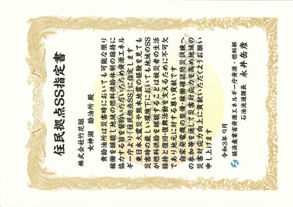 この度、竹花組 望月給油所・女神湖給油所の2店舗が『住民拠点サービスステーション』に認定されました👏