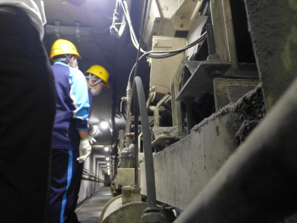 長野県佐久市塩名田にある生コン工場の向上の中を歩いて見学している様子の写真。