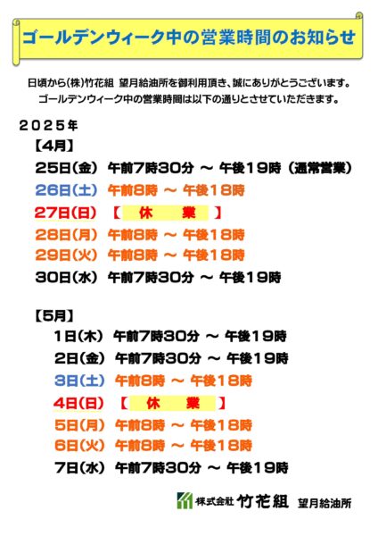 弊社では、下記日程にてゴールデンウィーク休業とさせていただきます。