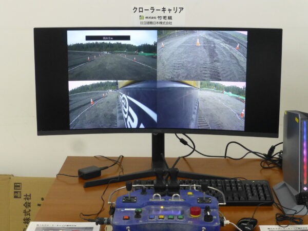 操作室から約3.5km離れた現場にあるこれらの重機を、まるでラジコンのような操作機器を使って遠隔操縦で動かします。実施されたのは、MCバックホウによる掘削と、キャリアダンプによる運搬です。